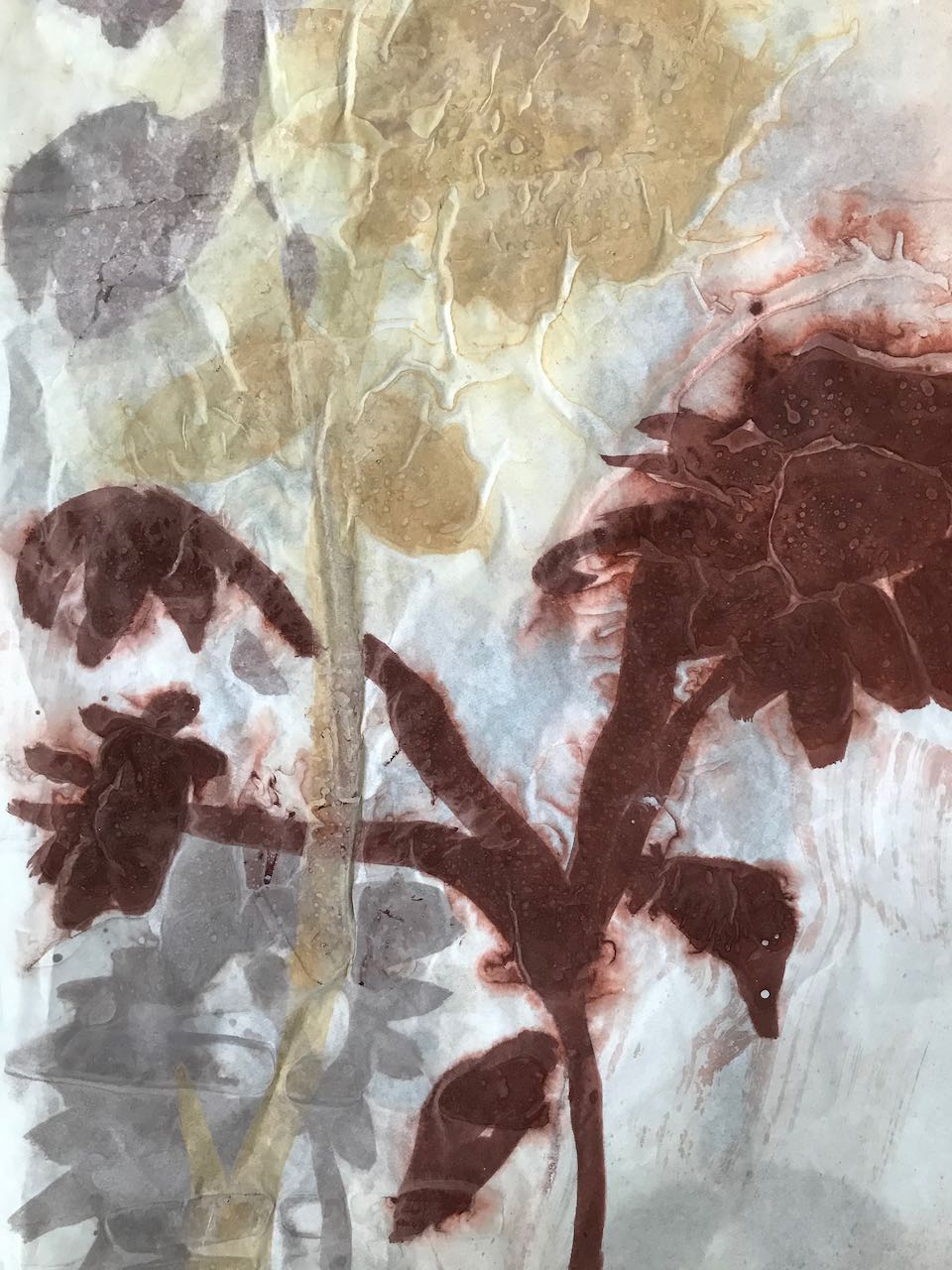 Als foto is de vertaling van deze waarneming van mij te zien; uitgevoerd op papier met natuurlijke verf. Met verschillende lagen aardetinten en opgeplakt Chinees papier ontstaat reliëf en structuur op het platte vlak.